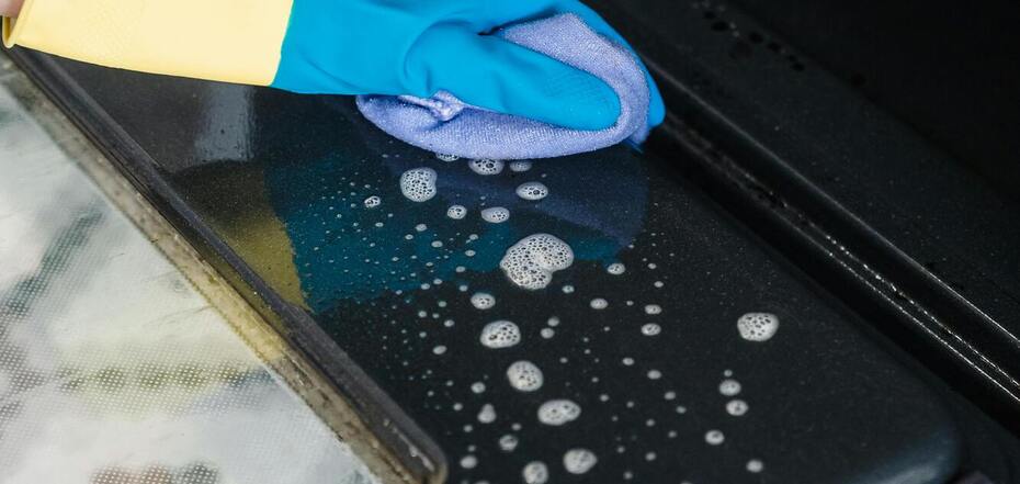 5. Смойте оставшиеся на стекле остатки теплой водой. Тщательно протрите дверцу духового шкафа тряпкой.