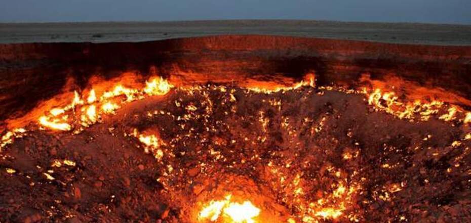 В пустыне Каракумы в Туркменистане десятилетиями горит огненный кратер. Официально его называют газовым кратером Дарваза, а в народе его называют "Ворота ада".