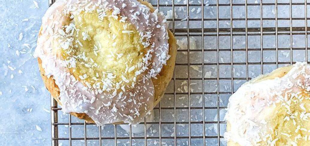 Сколеброд - це булочка з дріжджового тіста з начинкою ванільного заварного крему, покрита глазур'ю з місцевих вегетаріанських інгредієнтів і посипана тертим кокосом. Цей солодкий десерт або гарнір ідеально підходить для задоволення голоду протягом дня з ніжною цитрусово-м'ятною ноткою.